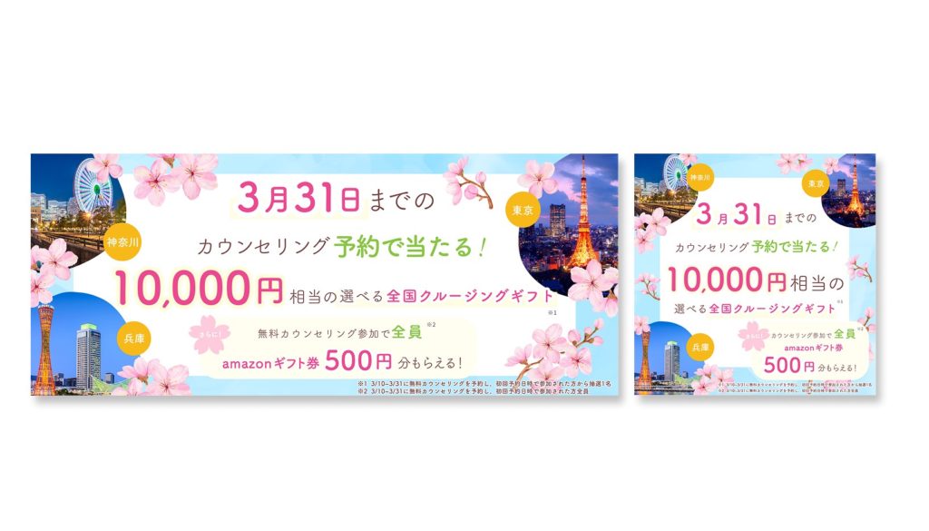 バナー作成 2025年10月3日 Last updated : 2025年10月3日 YUMIOGIWARA 【製作時間】3時間/1枚【使用ソフト】Photoshop・illustrator【担当業務】デザイン【意識した亊】春らしい季節感が伝わるデザインにしました。